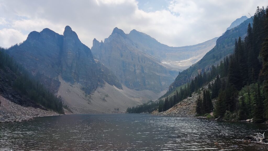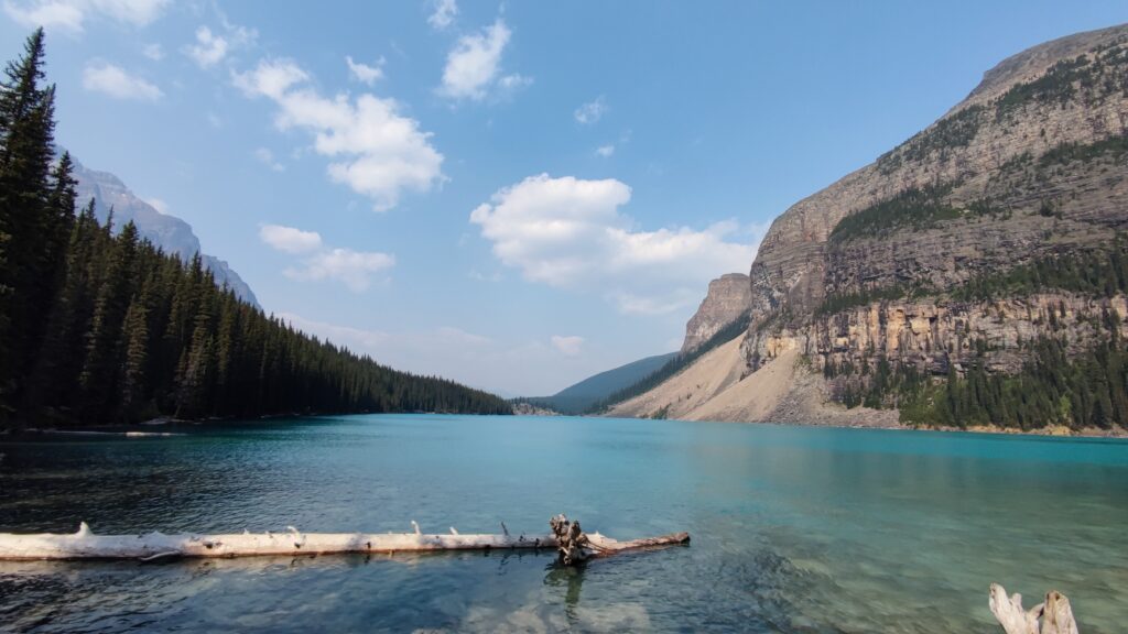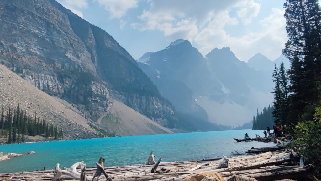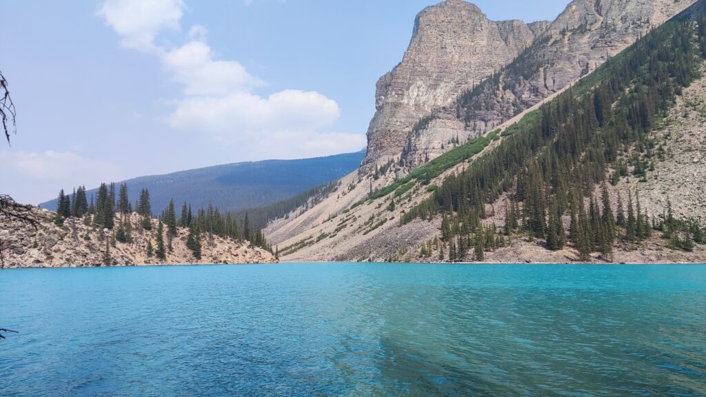 El lago Moraine, con una superficie total de medio kilómetro cuadrado, es alimentado gracias a un glaciar. Por tanto, alcanza su nivel máximo durante la segunda mitad del mes de junio. Su llamativo color azul, característico de los lagos de la zona de la Carretera de los campos de hielo (Icefields Parkway), proviene de la refracción de la luz a causa del polvo de roca depositado desde las montañas.